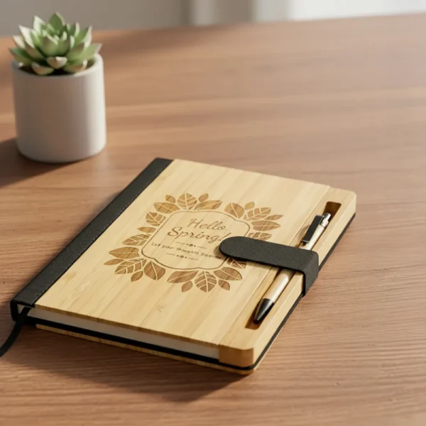 This premium eco-friendly A5 notebook is designed for modern professionals who value sustainability and style. Crafted from a combination of durable bamboo and 300D rPET fabric, it boasts a smooth, natural texture and long-lasting quality. The notebook comes with a matching bamboo pen featuring a black clip and blue ink refill, complemented by 96 lined, cream-colored sheets (70 gsm) for a superior writing experience. A built-in ribbon bookmark helps keep track of pages, while the magnetic clasp closure ensures security with a touch of elegance. Perfect for eco-conscious corporate gifting, promotional events, and daily office use, this notebook blends functionality with an environmentally responsible design.