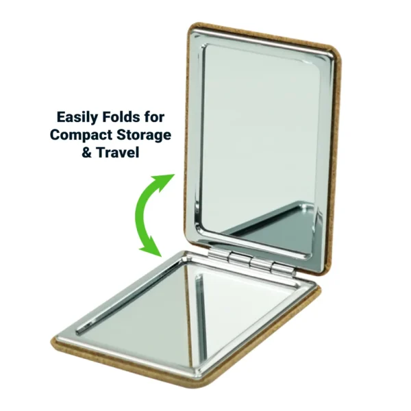 Eco-friendly rectangle pocket mirror with a stylish cork finish cover. Double-sided foldable design with standard and magnified mirrors. Compact, lightweight, and perfect for travel, beauty, or corporate giveaways. Packaged in a brown kraft carton box with custom branding available through UV DTF or screen printing.